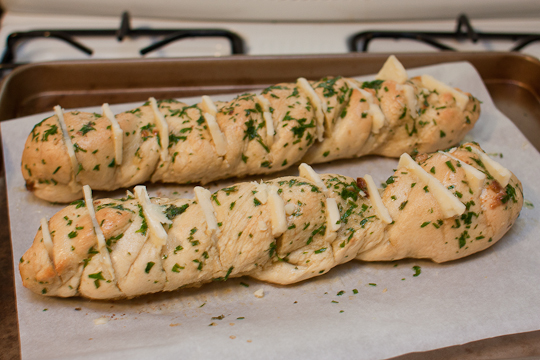 After putting the cheese into the sliced bread, I put the loaves back into the over for about 3 minutes to let the cheese melt. I didn’t use as much cheese as the recipe called for – I used closer to a quarter of a pound instead of a third. As a result, the cheesiness of the bread wasn’t as extreme as it appeared in the original pin, but the combination of the butter and the cheese that was there was more than rich enough. The only thing I think I’d do differently if I made this again would be to get my hands on a stand mixer, and maybe try it with bread flour to see how much of a difference it makes. Overall though, a good recipe to keep in the repertoire.