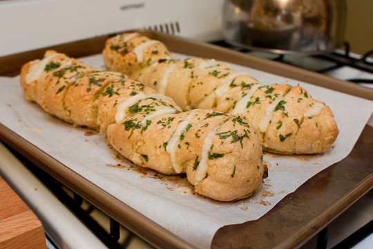 To make the butter, I roasted two cloves of garlic with their skins on in the oven for a half hour, with some olive oil and salt. After removing the skins, I mixed the roasted cloves with fresh chopped parsley, a stick of unsalted butter at room temperature, and a pinch of salt, and mashed it all together with a wooden spoon until it was evenly mixed. I then melted the butter and brushed the par-baked bread with it before putting it back in the oven for another 5 minutes.